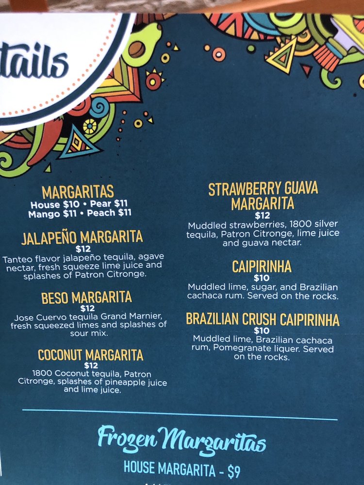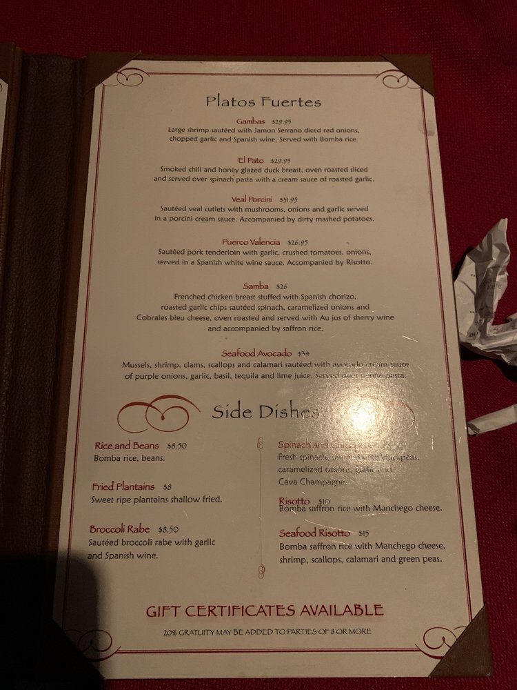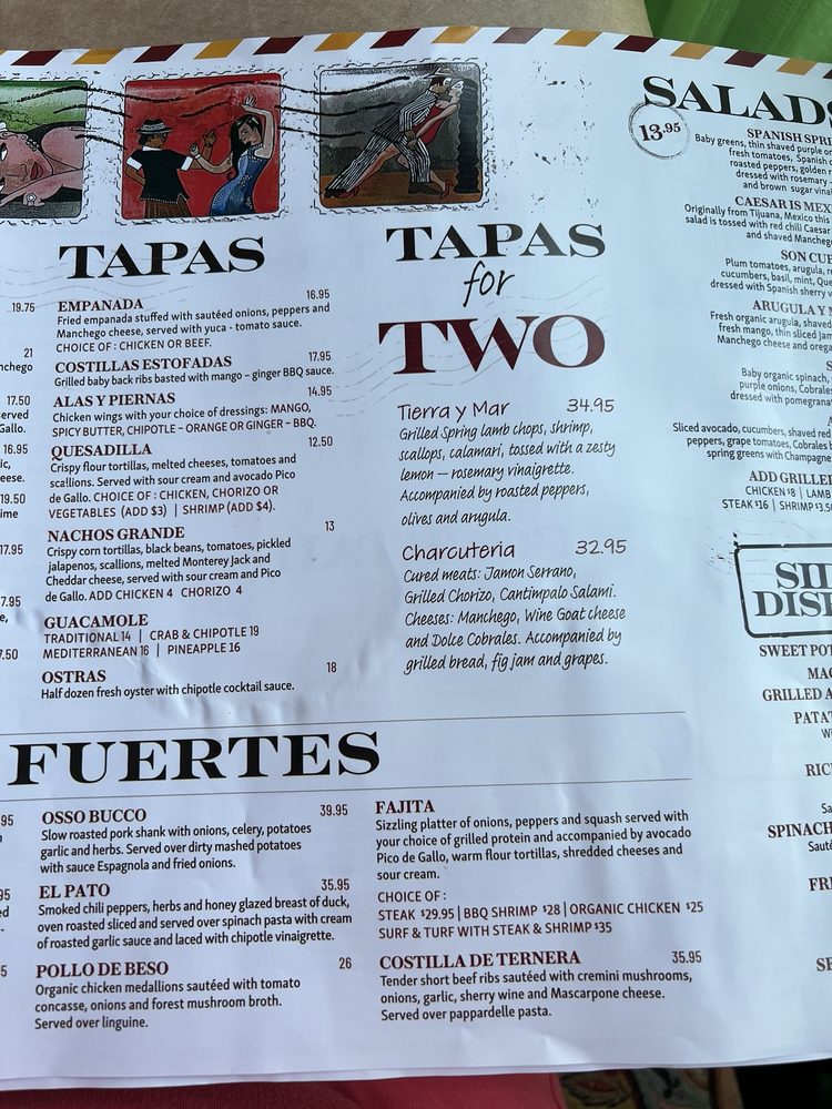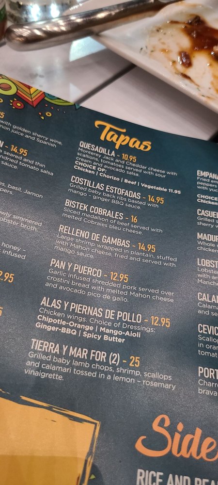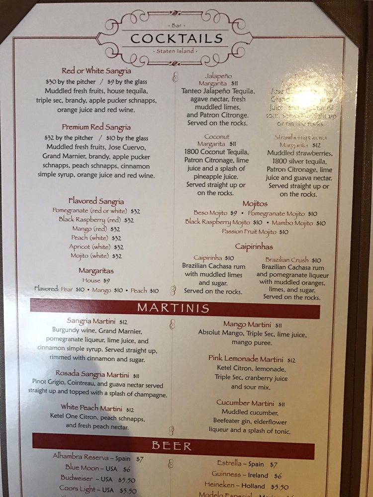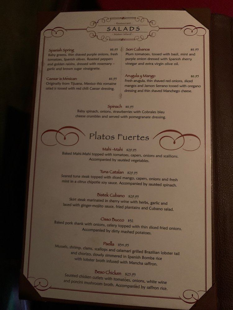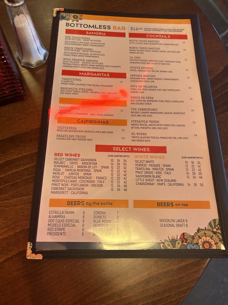 Introducing the menu at Beso, a Spanish Tapas Bar located in Staten Island, NY. Offering a variety of tapas, entrees, and sides, Beso has something for every palate. From the flavorful Camaron Al Ajillo shrimp to the Beso Chicken with saffron rice, the menu is full of Latin-inspired dishes that will tantalize your taste buds. Customer reviews rave about the elegant decor, fast service, and delectable tapas. Don't miss out on the opportunity to experience the lively atmosphere and delicious food at Beso. Whether you're looking for a romantic date night spot or a good place to gather with friends, Beso is sure to impress with its diverse menu and cozy ambiance.